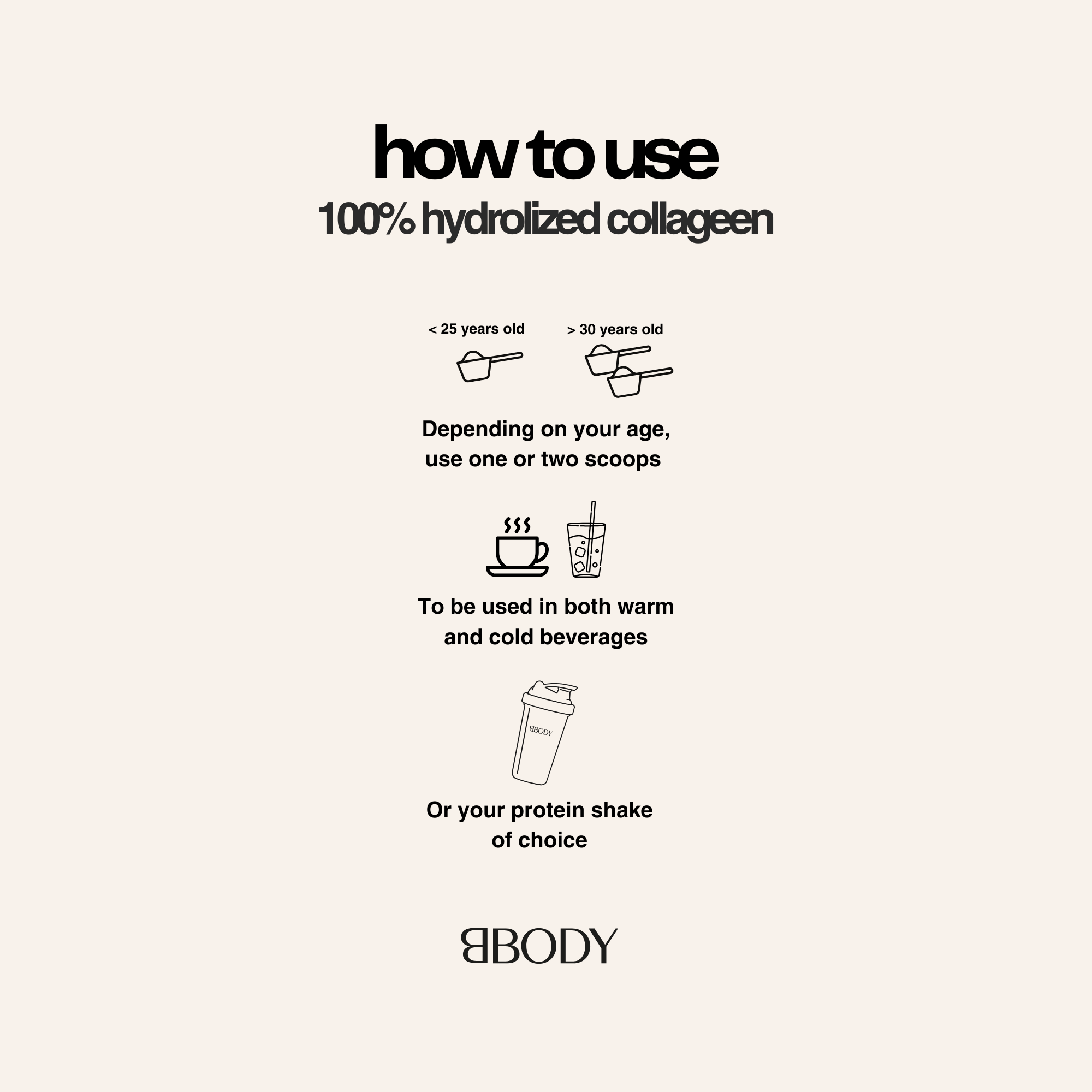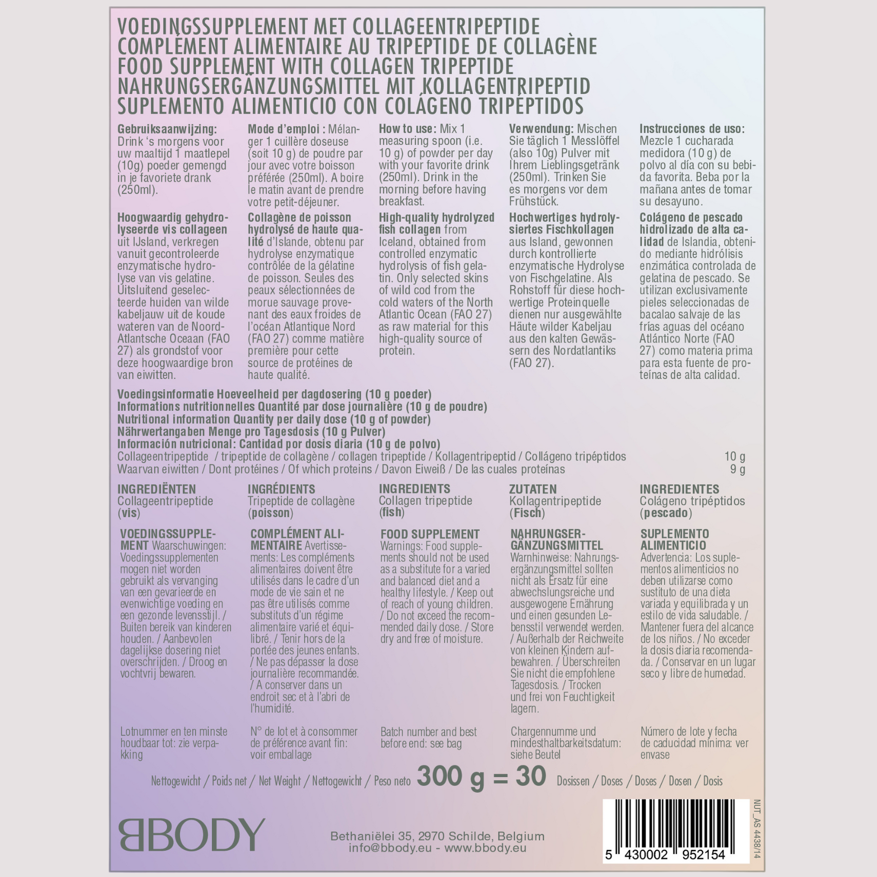 BBODY's Tripeptide Collagen is a premium collagen supplement specially formulated to support your skin from the inside out. Derived from wild cod in the clean waters of Iceland, this high-quality collagen provides a pure and effective source of tripeptide collagen. Compared to regular hydrolyzed collagen, tripeptide collagen has the advantage of smaller molecules for faster and more efficient absorption. In addition, it contains a high concentration of effective amino acids such as glycine, proline and hydroxyproline.