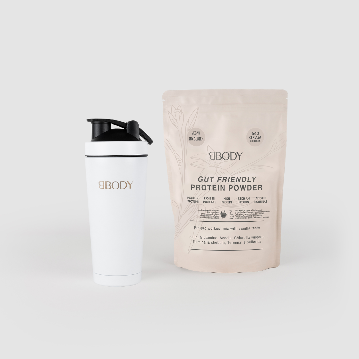 The BBODY Protein Shake + Shaker Cup Pack gives you everything you need for a complete and nutritious protein experience. This pack contains BBODY's vegan protein powder, known for its gut-friendly properties and high-quality ingredients, along with a stylish and durable metal shaker cup (black lid). This combination makes it easy to enjoy your protein shake on the go or at home.