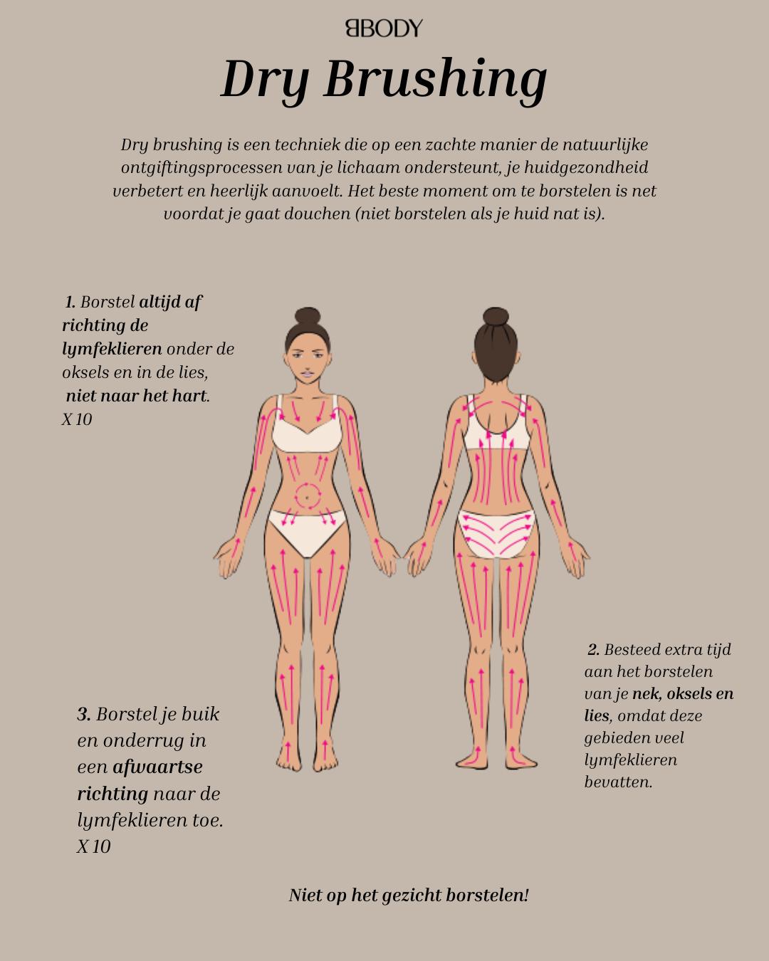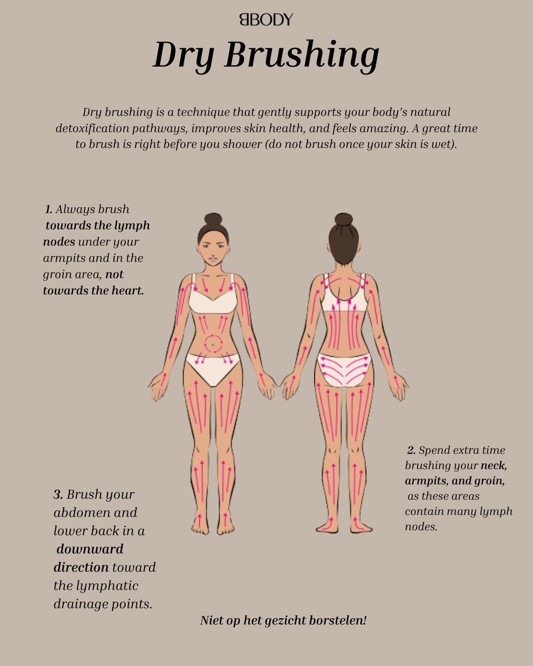 Spazzolare la pelle con un dry brush si fa su pelle asciutta prima di andare a dormire o prima di fare la doccia. Questo serve a rimuovere le cellule morte della pelle affinché la tua pelle possa essere idratata meglio e la tua crema penetri di più.