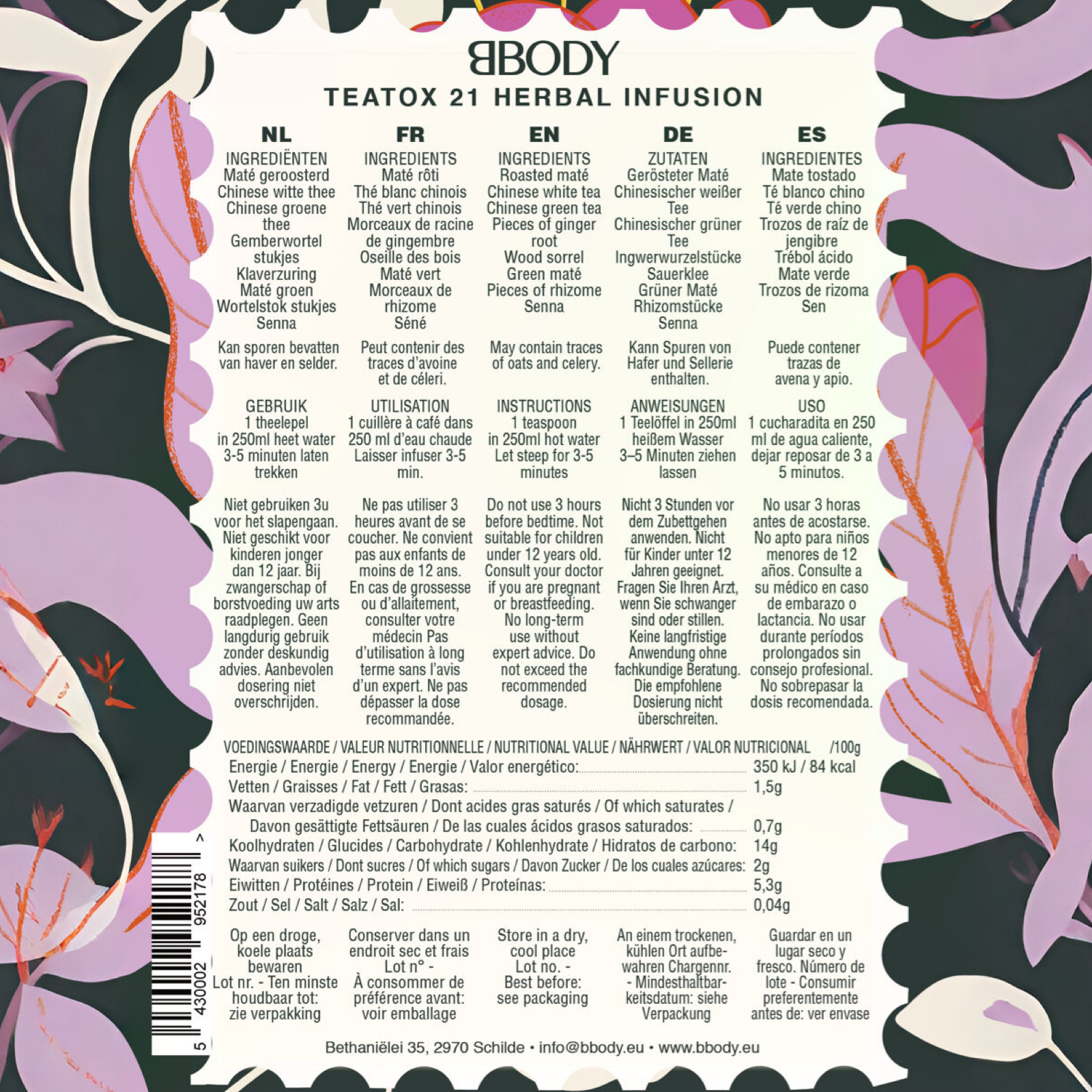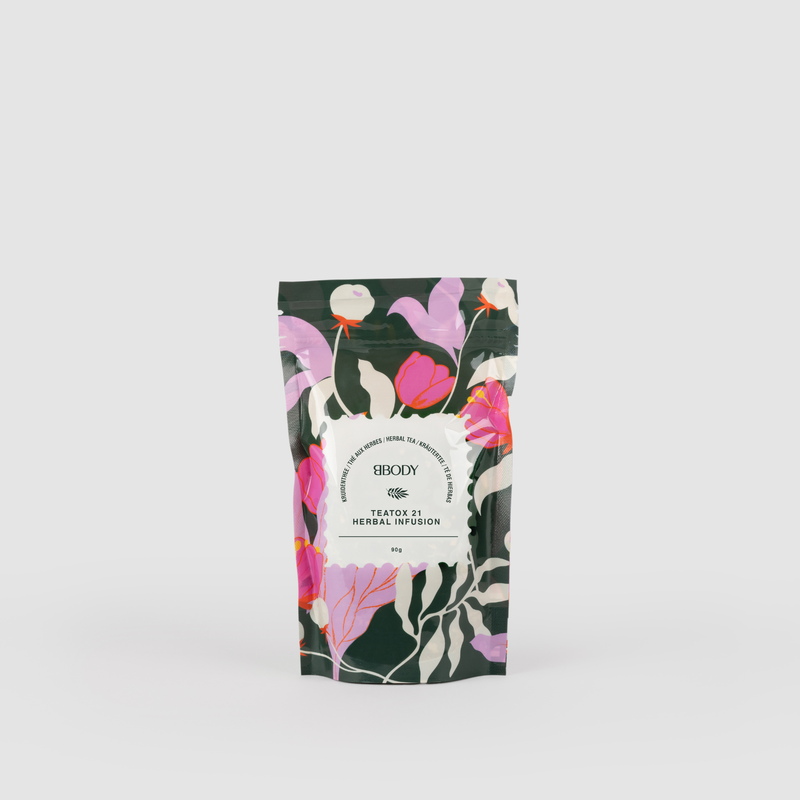 De Teatox 21 van BBODY to oryginalny produkt, od którego wszystko się zaczęło i jedna z pierwszych premier BBODY. Ta sprawdzona mieszanka pomogła już tysiącom klientów osiągnąć ich cele i jest stworzona z wysokiej jakości składników, takich jak chińska biała herbata, zielona herbata, senna, zielona maté i prażona maté. Unikalna kombinacja zapewnia bogate, orzeźwiające doznania smakowe i jest idealna, aby wspierać Twoją podróż ku dobremu samopoczuciu. Ważne: ta herbata została zaprojektowana do picia przez 21 dni. Po tym okresie zaleca się przejście na przynajmniej miesiąc na Teatox Daily.