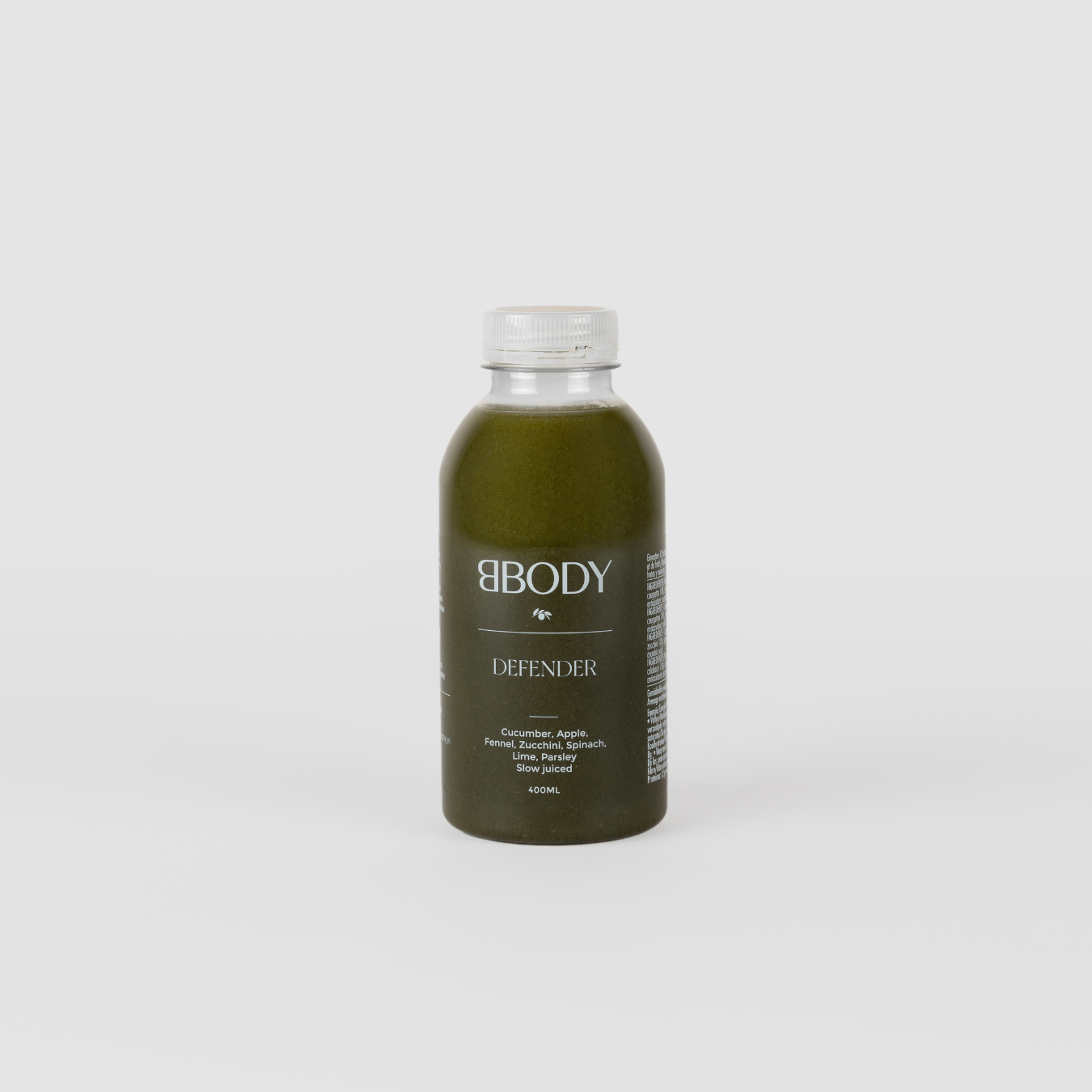 De BBODY Defender is een koudgeperst sapje met een uitgebalanceerde mix van komkommer, appel, venkel, courgette, spinazie, limoen en peterselie. Door het gebruik van High Pressure Processing (HPP) blijven de smaken en voedingsstoffen optimaal behouden, zodat je elke dag kunt genieten van een pure en verfrissende smaak. HPP zorgt ervoor dat alle vitaminen en mineralen intact blijven, waardoor het sap langer vers blijft zonder conserveermiddelen.