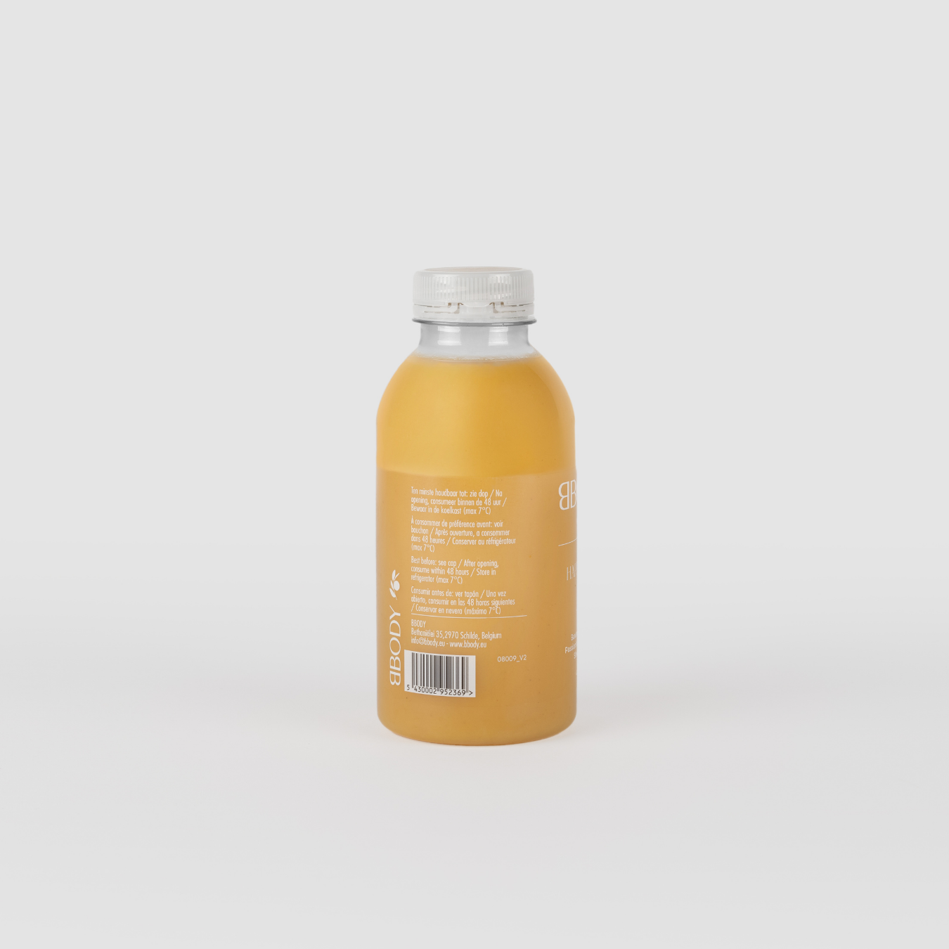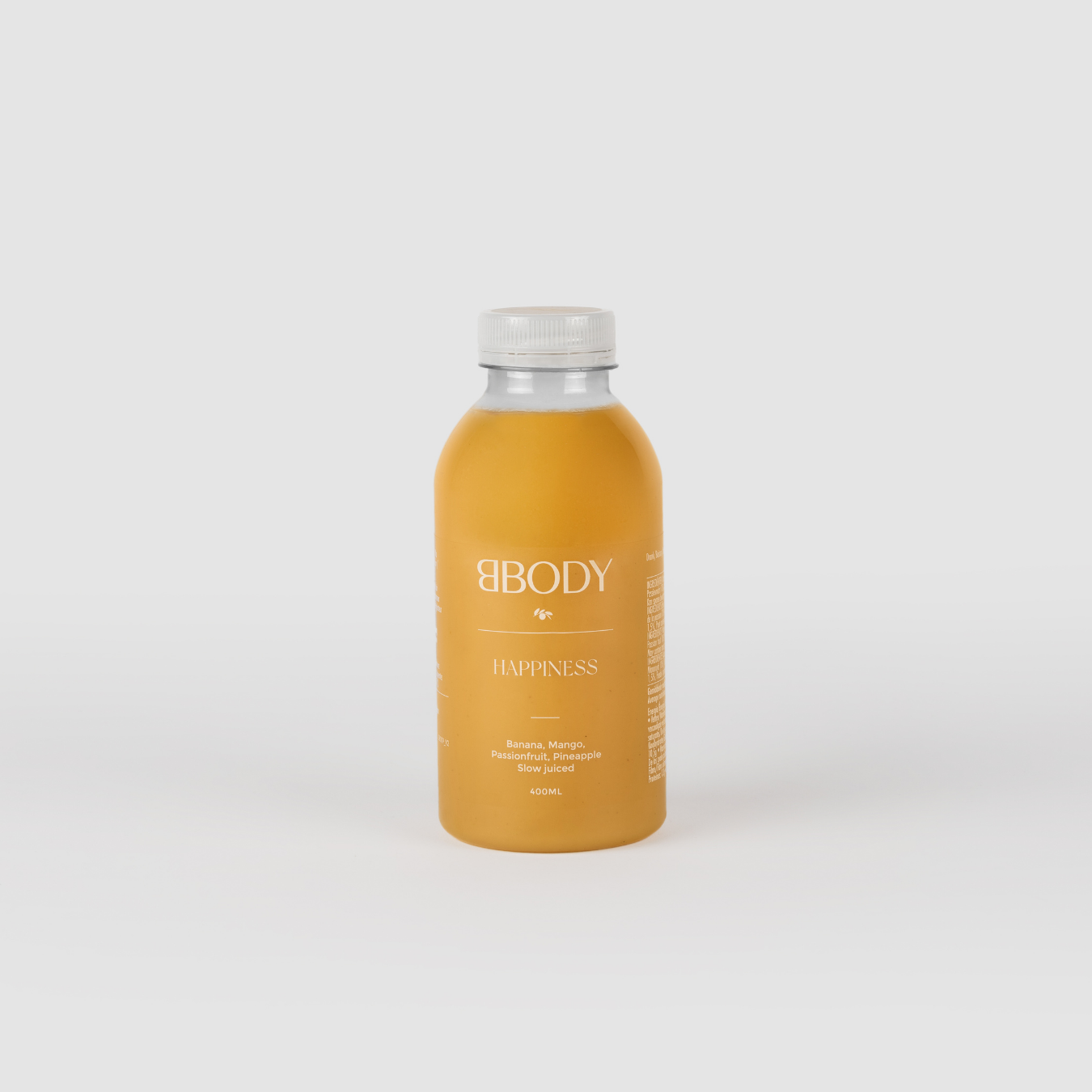 Het Happiness-sapje van BBODY is een exotische mix van banaan, mango, passievrucht en ananas, ontworpen om je een moment van puur genot te geven. Deze tropische blend brengt een zonnige, verfrissende smaak die perfect is om je dag mee te beginnen of als verkwikkend tussendoortje. Het sapje is HPP-verwerkt om de versheid en voedingswaarde te behouden, zodat je altijd kunt genieten van de optimale smaak en voordelen.